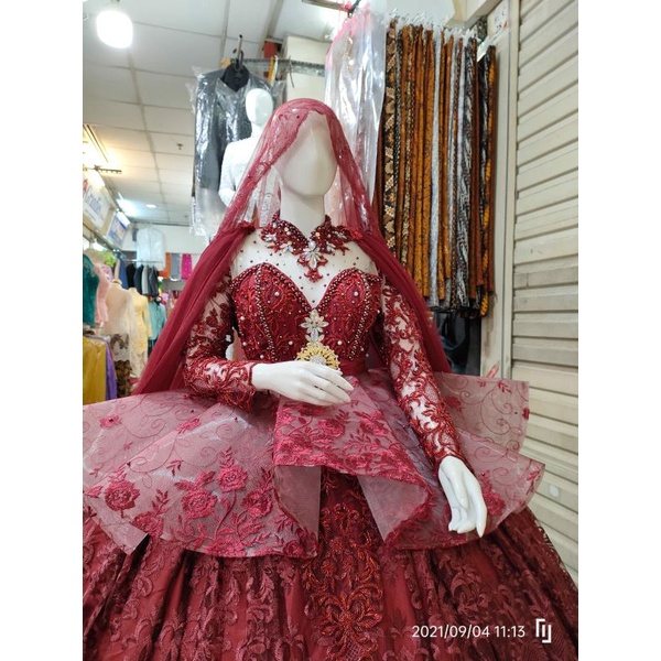 Baju gaun pengantin warna merah marun model krinolin full payet motif bunga garis garis wedding dress gown mekar muslim wanita perempuan .